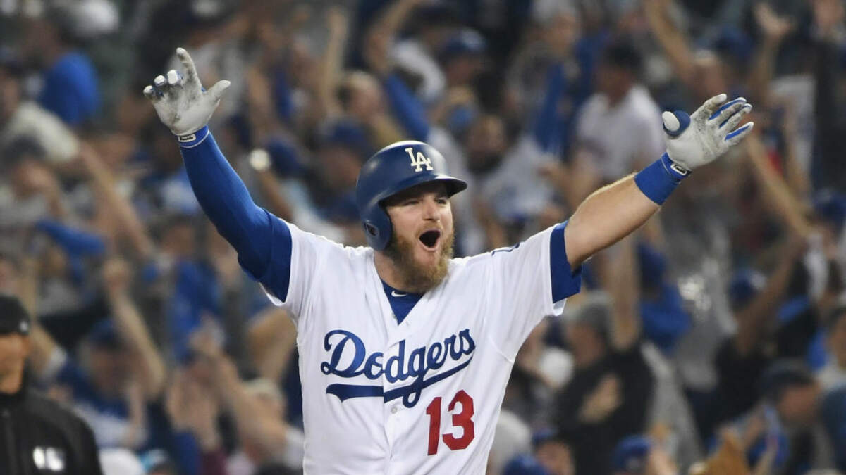 Photo: Max Muncy #13 of the Los Angeles Dodgers celebrates his eighteenth inning walk-off home run to defeat the the Boston Red Sox 3-2 in Game Three of the 2018 World Series at Dodger Stadium. (Getty Images)