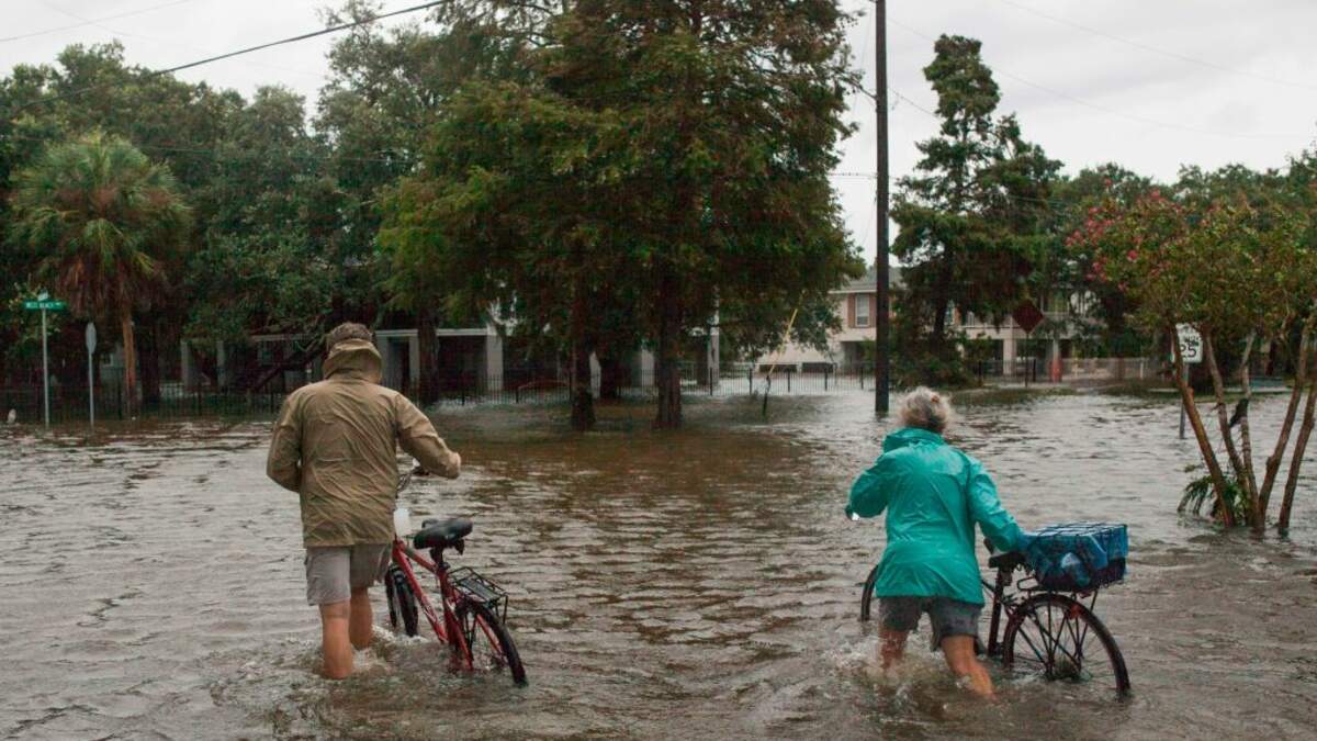 Photo: A couple walks their bikes through a flooded street after Tropical Storm Barry came ashore in Mandeville, Louisiana. (Getty Images)