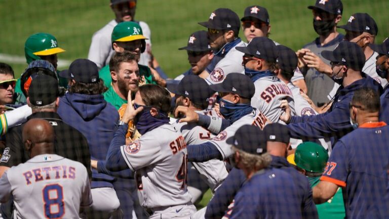 The benches cleared in the seventh inning and multiple players were ejected as the A's topped the Astros 7-2 in Oakland. Ramon Laureano was hit by a pitch for the third time in the series and charged Astros hitting coach Alex Cintron in the dugout. Robbie Grossman, Matt Olson and Matt Chapman all homered for Oakland, which won its ninth straight. Rookie Jesus Luzardo earned his first big league win. Yuli Gurriel launched a two-run homer for Houston, while rookie Christian Javier took the loss. The Astros are on a five-game slide.