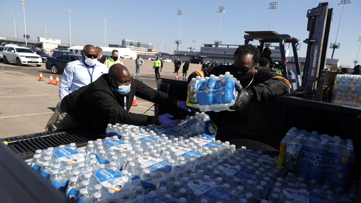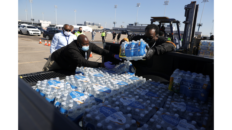 Photo: Volunteers load cases of water into the bed of a truck during a mass water distribution at Delmar Stadium on in Houston (Getty Images)