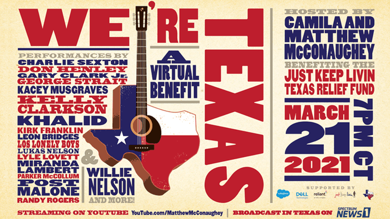 Matthew McConaughey and his wife Camilla have called upon all their Hollywood friends and Texans to come together to help our neighbors this Sunday night, March 21 at 7PM to raise money to help those who need it.