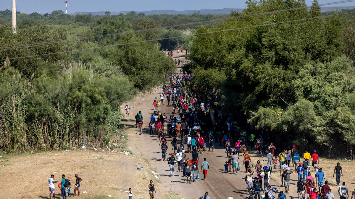 DEL RIO, TX - SEPTEMBER 17: Migrants, mostly from Haiti, gather at a makeshift encampment under the International Bridge on the broder between Del Rio, TX and Acuña, MX on September 17, 2021 in Del Rio, Texas.