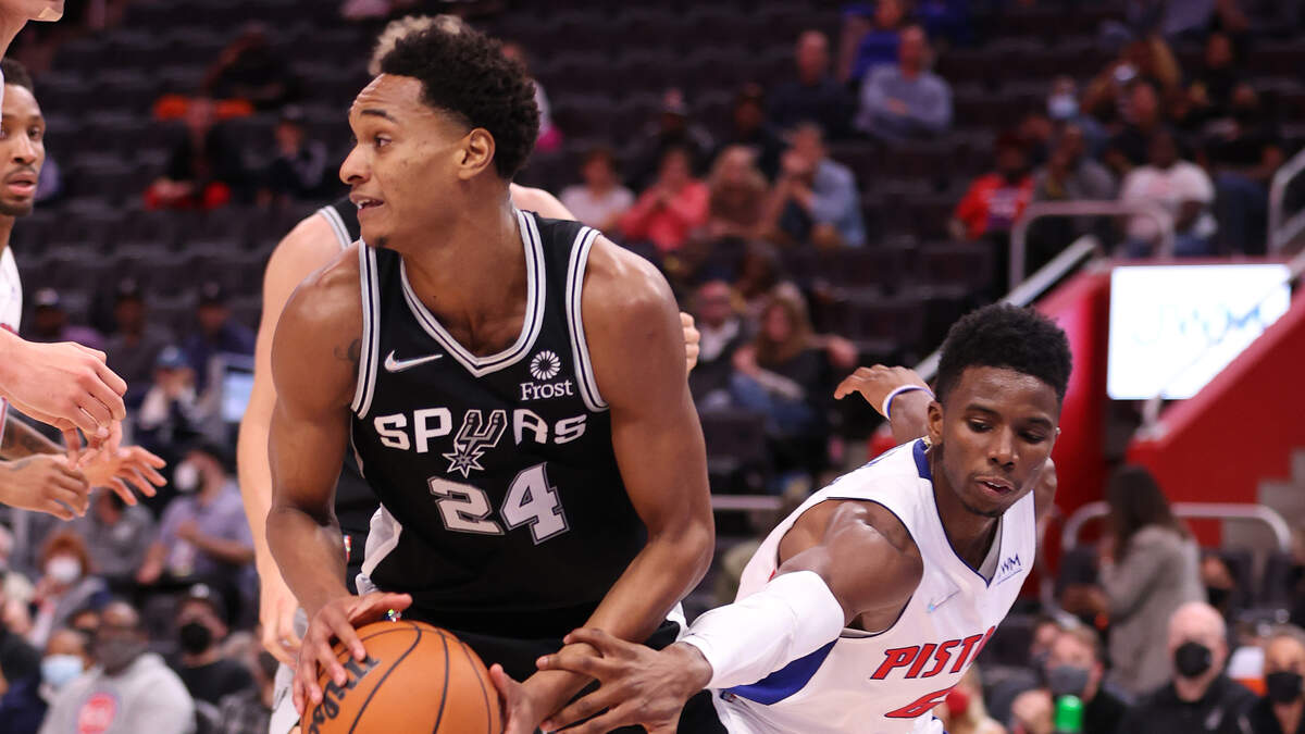 Devin Vassell #24 of the San Antonio Spurs tries to avoid the defense of Hamidou Diallo #6 of the Detroit Pistons during a preseason game at Little Caesars Arena on October 06, 2021 in Detroit, Michigan.