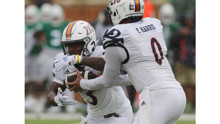 Sincere McCormick #3 of the UTSA Roadrunners takes the handoff from Frank Harris #0 against the North Texas Mean Green at Apogee Stadium on November 27, 2021 in Denton, Texas.