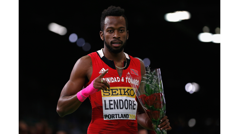 Bronze medallist Deon Lendore of Trinidad and Tobago celebrates after the Men's 400 Metres Final during day three of the IAAF World Indoor Championships at Oregon Convention Center on March 19, 2016 in Portland, Oregon.