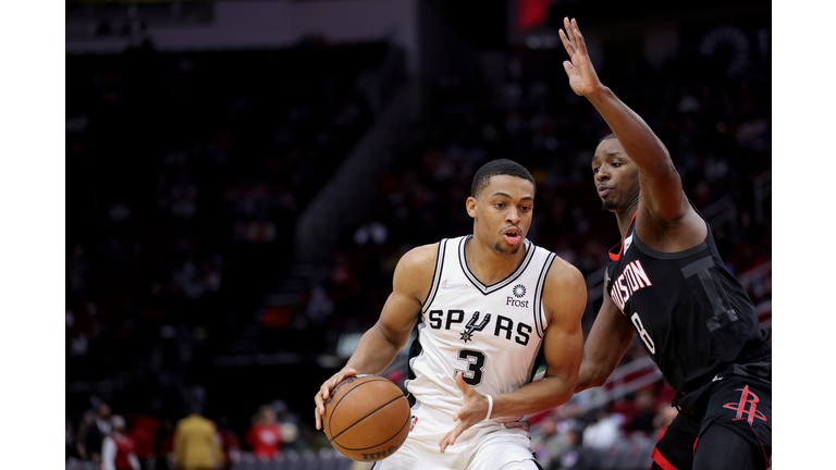 Keldon Johnson #3 of the San Antonio Spurs controls the ball against Jae'Sean Tate #8 of the Houston Rockets during the second half at Toyota Center in Houston.