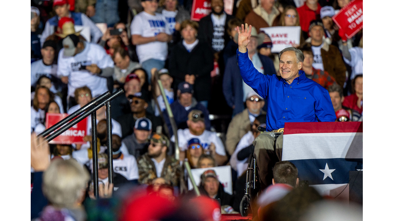 Texas Gov. Greg Abbott waves to supporters during the 'Save America' rally at the Montgomery County Fairgrounds in Conroe.