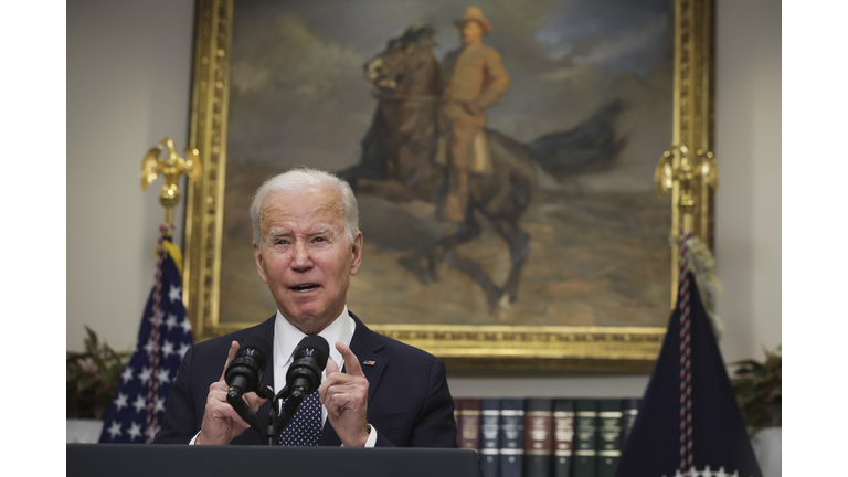 President Joe Biden arrives to speak to update the situation of the Ukraine-Russia border crisis during an event in Roosevelt Room of the White House on February 18, 2022 in Washington, DC. President Joe Biden gave an update after he held a phone call with Transatlantic leaders to continue diplomatic and deterrence efforts to deescalate the crisis that has been caused by a heavy deployment of Russian troops along the border between the two counties. (Photo by Alex Wong/Getty Images)