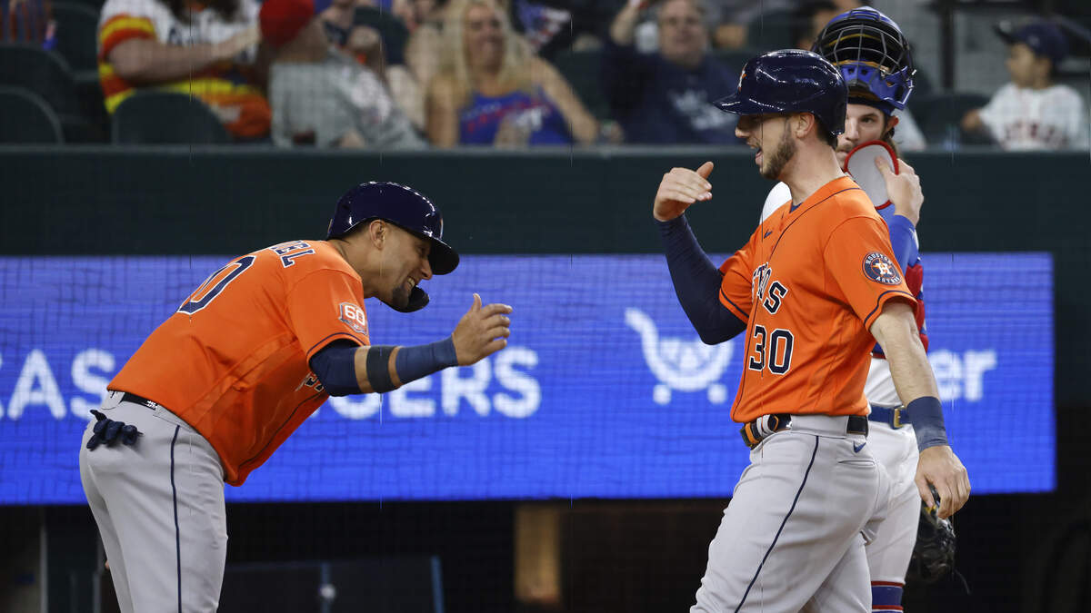 Yuli Gurriel #10 and teammate Kyle Tucker #30 of the Houston Astros celebrate Tuckers two-run home run against the Texas Rangers during the fourth inning at Globe Life Field on April 26, 2022 in Arlington, Texas. (Getty Images)