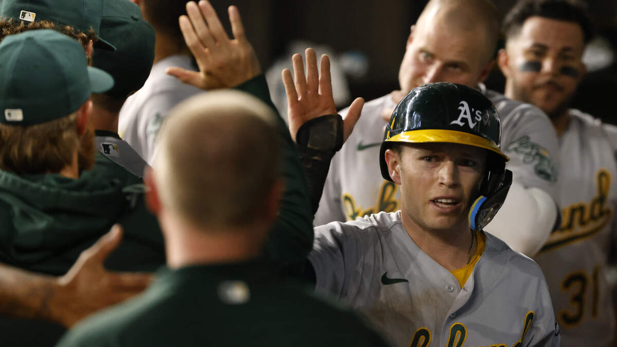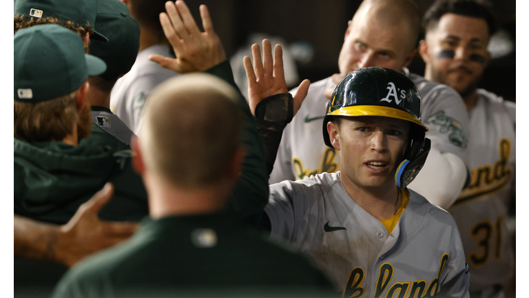 Nick Allen #2 of the Oakland Athletics celebrates scoring a run against the Texas Rangers in the 12th inning at Globe Life Field on July 12, 2022 in Arlington, Texas.