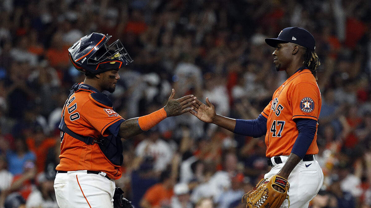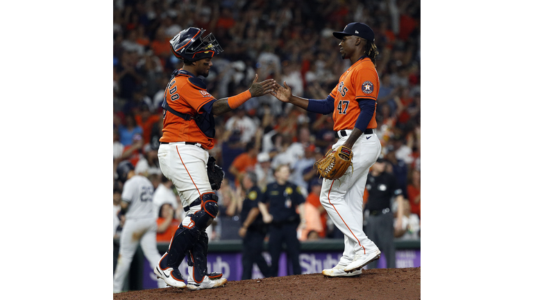 Martin Maldonado #15 and Rafael Montero of the Houston Astros celebrate a 7-5 win over the New York Yankees in game two of a doubleheader at Minute Maid Park on July 21, 2022 in Houston, Texas. (Photo by Bob Levey/Getty Images)