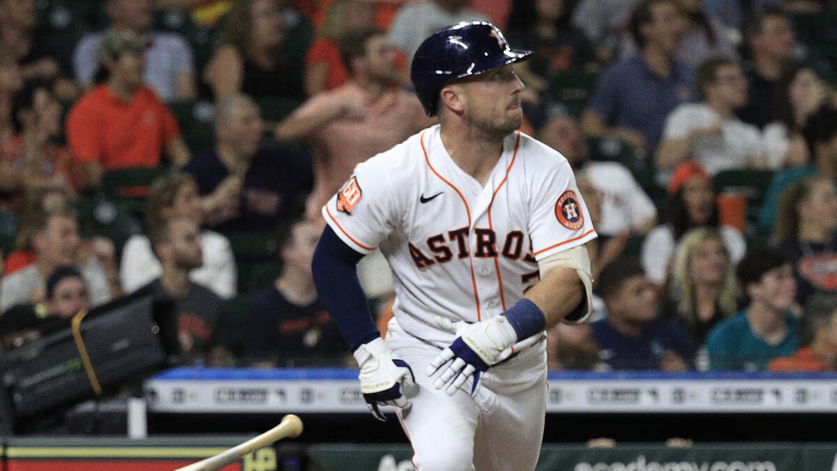Alex Bregman #2 of the Houston Astros doubles in a run in the eighth inning against the Seattle Mariners at Minute Maid Park on July 28, 2022 in Houston, Texas. (Photo by Bob Levey/Getty Images)