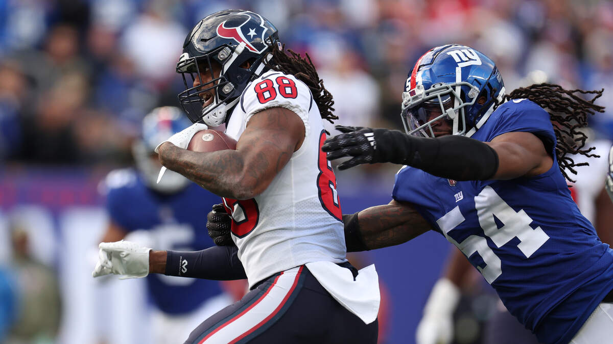 Jordan Akins #88 of the Houston Texans is chased by Jaylon Smith #54 during the second half at MetLife Stadium on November 13, 2022 in East Rutherford, New Jersey. (Photo by Jamie Squire/Getty Images)