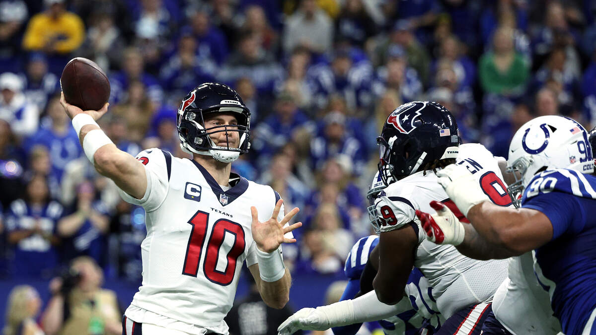 Quarterback Davis Mills #10 of the Houston Texans passes during the game against the Indianapolis Colts at Lucas Oil Stadium on January 08, 2023 in Indianapolis, Indiana. (Photo by Michael Hickey/Getty Images)