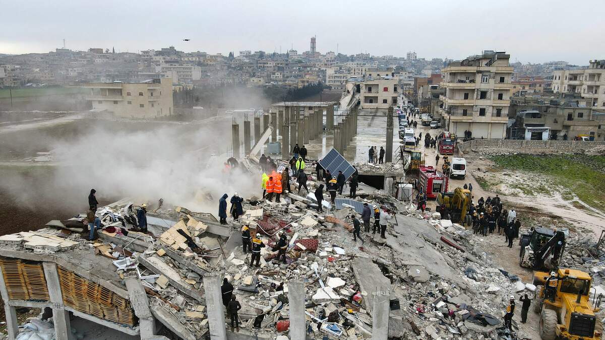 This aerial view shows residents helped by bulldozers, searching for victims and survivors in the rubble of collapsed buildings, following an earthquake in the town of Sarmada in the countryside of the northwestern Syrian Idlib province, early on February 6, 2023. (Getty Images)