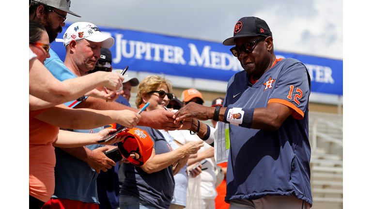 Dusty Baker Jr. #12 of the Houston Astros signs autographs for fans prior to a game at Roger Dean Stadium on March 06, 2023 in Jupiter, Florida. (Photo by Megan Briggs/Getty Images)