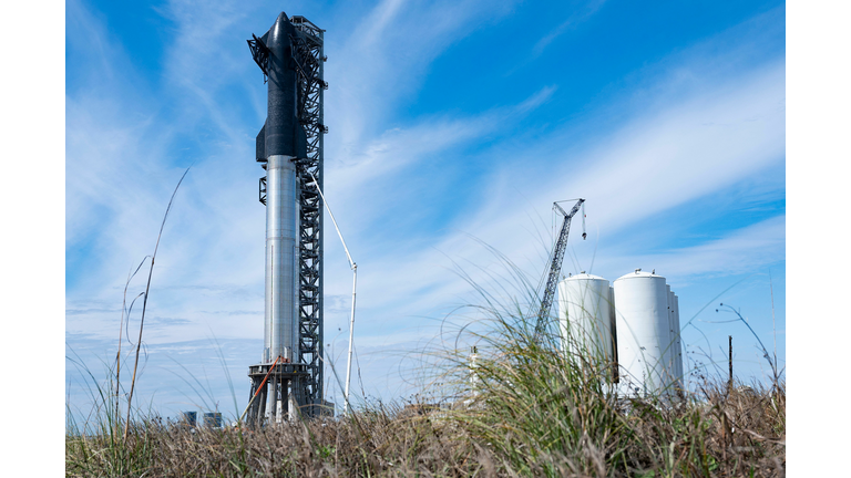 SpaceX's first orbital Starship SN20 is stacked atop its massive Super Heavy Booster 4 at the company's Starbase facility near Boca Chica Village in South Texas on February 10, 2022.