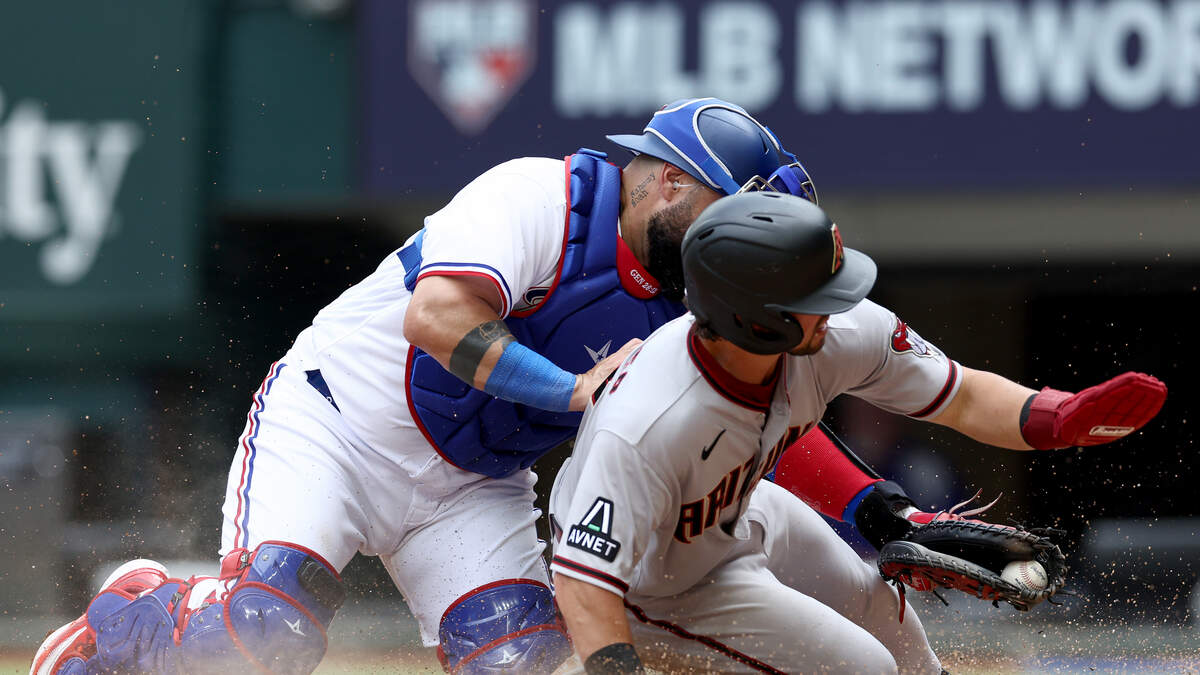 Sandy Leon #12 of the Texas Rangers tags out Dominic Fletcher #8 of the Arizona Diamondbacks at home plate in the top of the seventh inning at Globe Life Field on May 03, 2023 in Arlington, Texas.