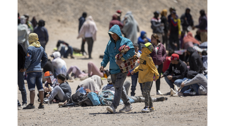 Immigrants walk through a makeshift migrant camp on May 11, 2023 in El Paso, Texas.