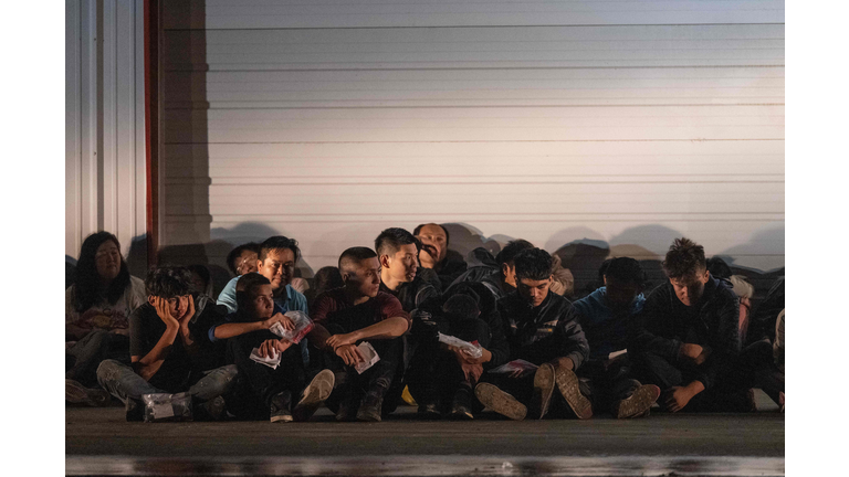 Migrants wait for a bus to take them to a processing center after they turned themselves over to US Border Patrol agents after crossing over from Mexico in Fronton, Texas on May 12, 2023.