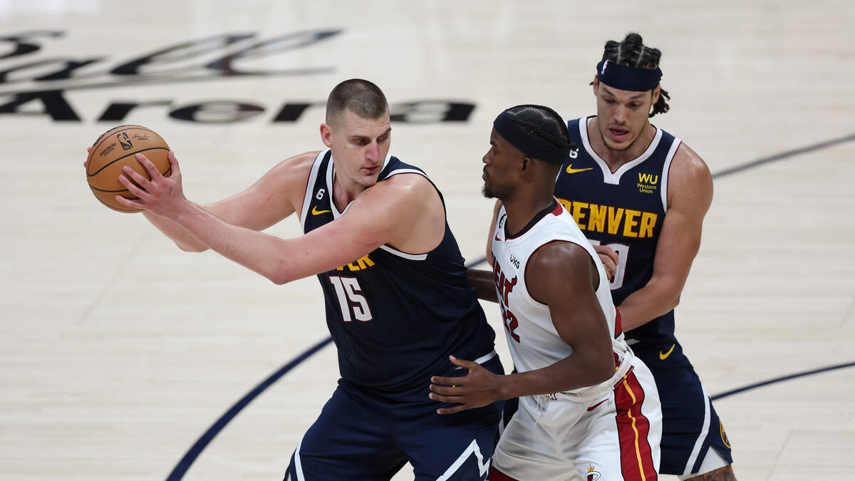 Jimmy Butler #22 of the Miami Heat defends against Nikola Jokic #15 of the Denver Nuggets during the fourth quarter in Game Two of the 2023 NBA Finals at Ball Arena on June 04, 2023 in Denver, Colorado.