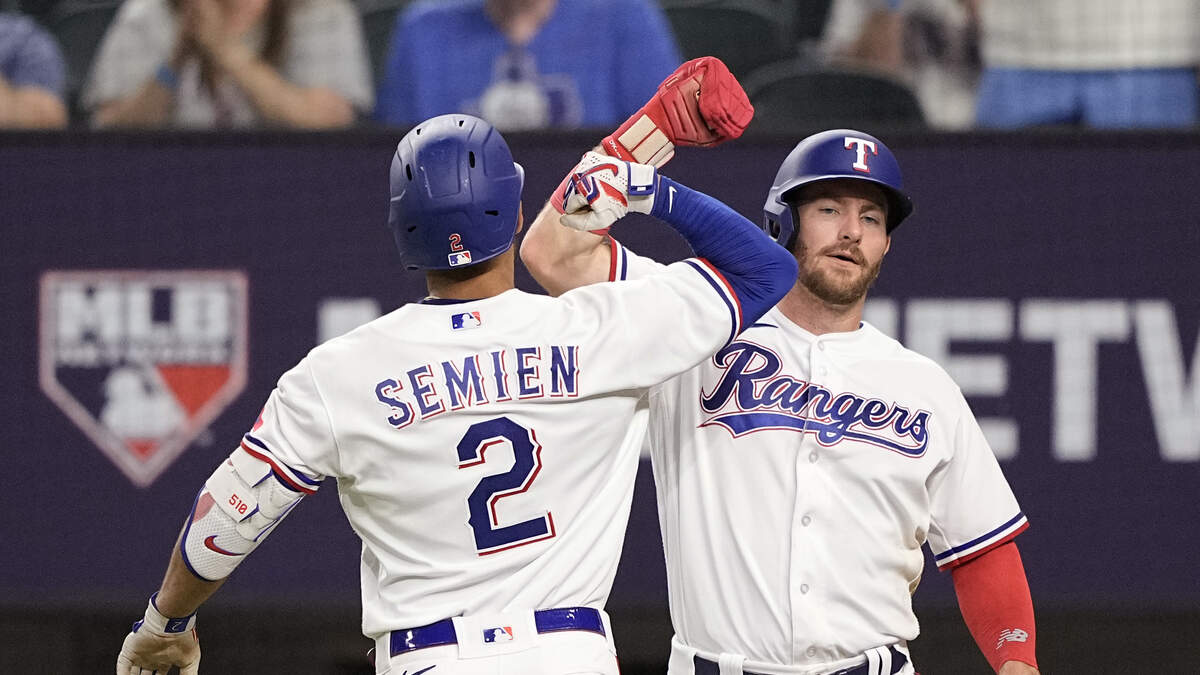 Marcus Semien #2 of the Texas Rangers celebrates his two-run home run with Robbie Grossman #4 in the seventh inning against the Los Angeles Angels at Globe Life Field on June 14, 2023 in Arlington, Texas.