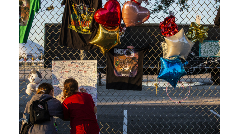 People attend a makeshift memorial on November 7, 2021 at the NRG Park grounds where people died in a crowd surge at the Astroworld Festival in Houston, Texas.