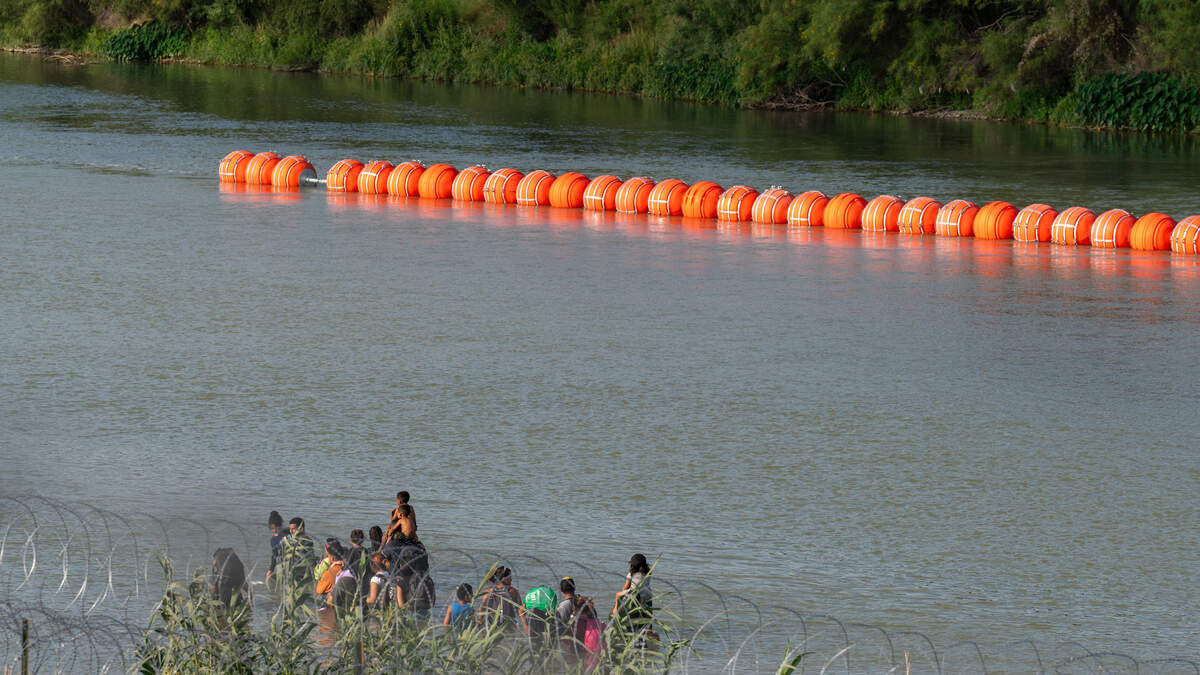 Migrants walk by a string of buoys placed on the water along the Rio Grande border with Mexico in Eagle Pass, Texas, on July 16, 2023. The buoy installation is part of an operation Texas is pursuing to secure its borders.