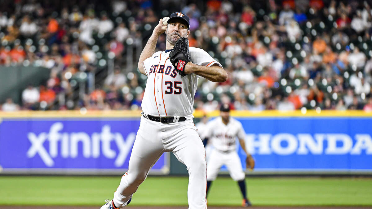 Justin Verlander #35 of the Houston Astros pitches in the first inning against the Boston Red Sox at Minute Maid Park on August 22, 2023 in Houston, Texas.