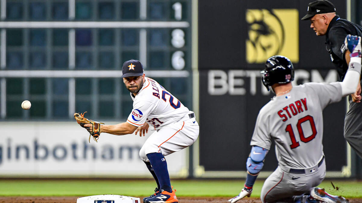 Jose Altuve #27 of the Houston Astros waits for the throw before unsuccessfully tagging out Trevor Story #10 of the Boston Red Sox at second base at Minute Maid Park on August 23, 2023 in Houston, Texas.