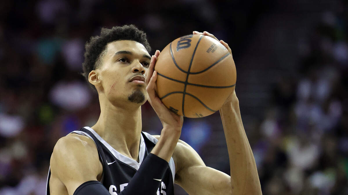 Victor Wembanyama #1 of the San Antonio Spurs shoots a free throw against the Portland Trail Blazers in the second half of a 2023 NBA Summer League game at the Thomas & Mack Center on July 09, 2023 in Las Vegas, Nevada.