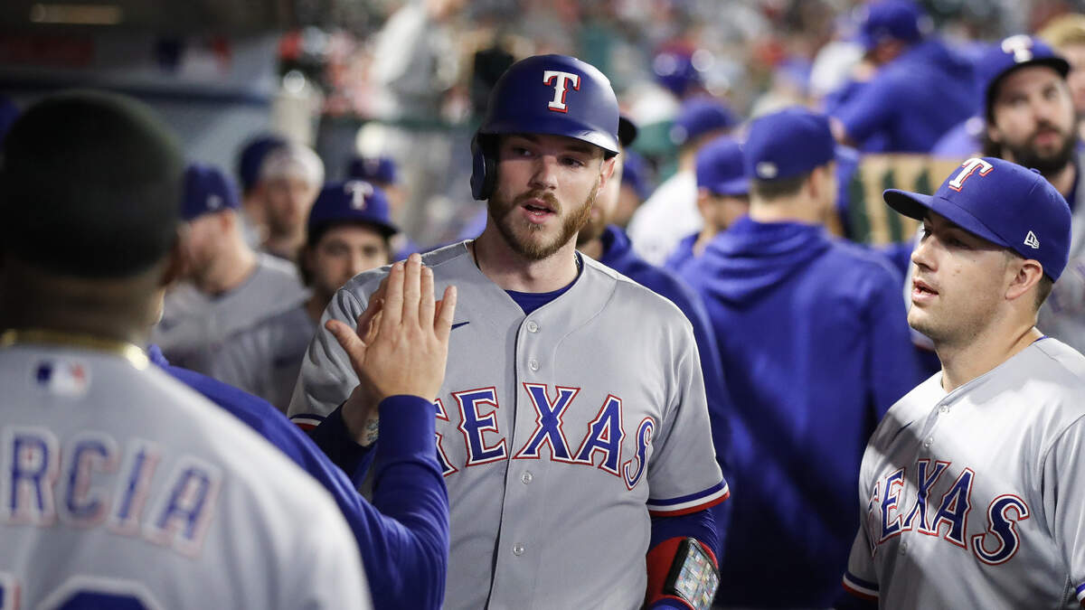Jonah Heim #28 of the Texas Rangers celebrates in the dugout after scoring on a wild pitch in the eighth inning against the Los Angeles Angels at Angel Stadium of Anaheim on September 25, 2023 in Anaheim, California.