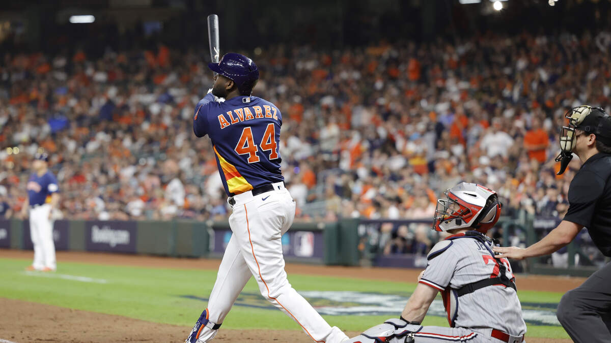 Yordan Alvarez #44 of the Houston Astros hits a two-run home run against the Minnesota Twins during the eighth inning in Game Two of the Division Series at Minute Maid Park on October 08, 2023 in Houston, Texas.