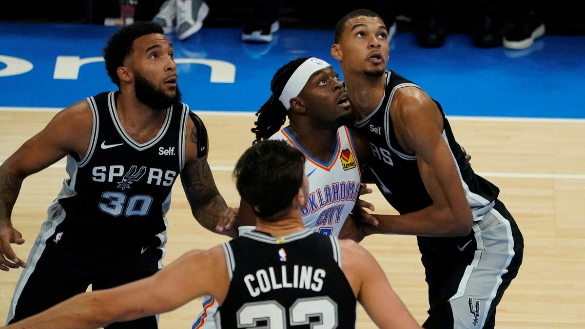 San Antonio Spurs US forward #30 Julian Champagnie, San Antonio Spurs US power forward #23 Zach Collins, and San Antonio Spurs French center #01 Victor Wembanyama defend against Oklahoma City Thunder's Canadian guard #05 Luguentz Dort during the NBA pre-season basketball game between San Antonio Spurs and Oklahoma City Thunder at Paycom Center arena in Oklahoma City, Oklahoma, on October 9, 2023.