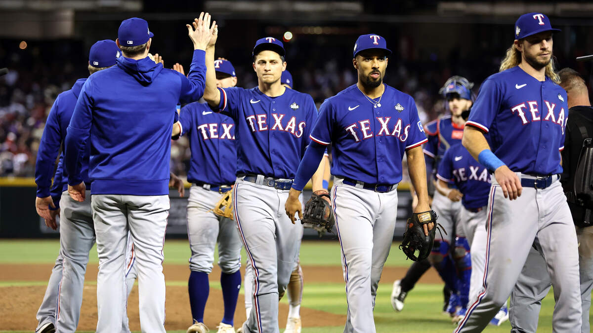 The Texas Rangers celebrate after beating the Arizona Diamondbacks 3-1 in Game Three of the World Series at Chase Field on October 30, 2023 in Phoenix, Arizona.