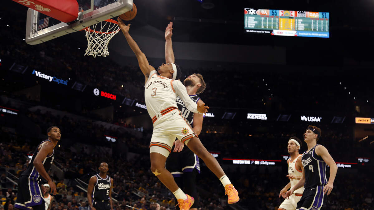 Keldon Johnson #3 of the San Antonio Spurs goes to the basket past Domantas Sabonis #10 of the Sacramento Kings in the first half of an NBA In-Season Tournament game at Frost Bank Center on November 17, 2023 in San Antonio, Texas.