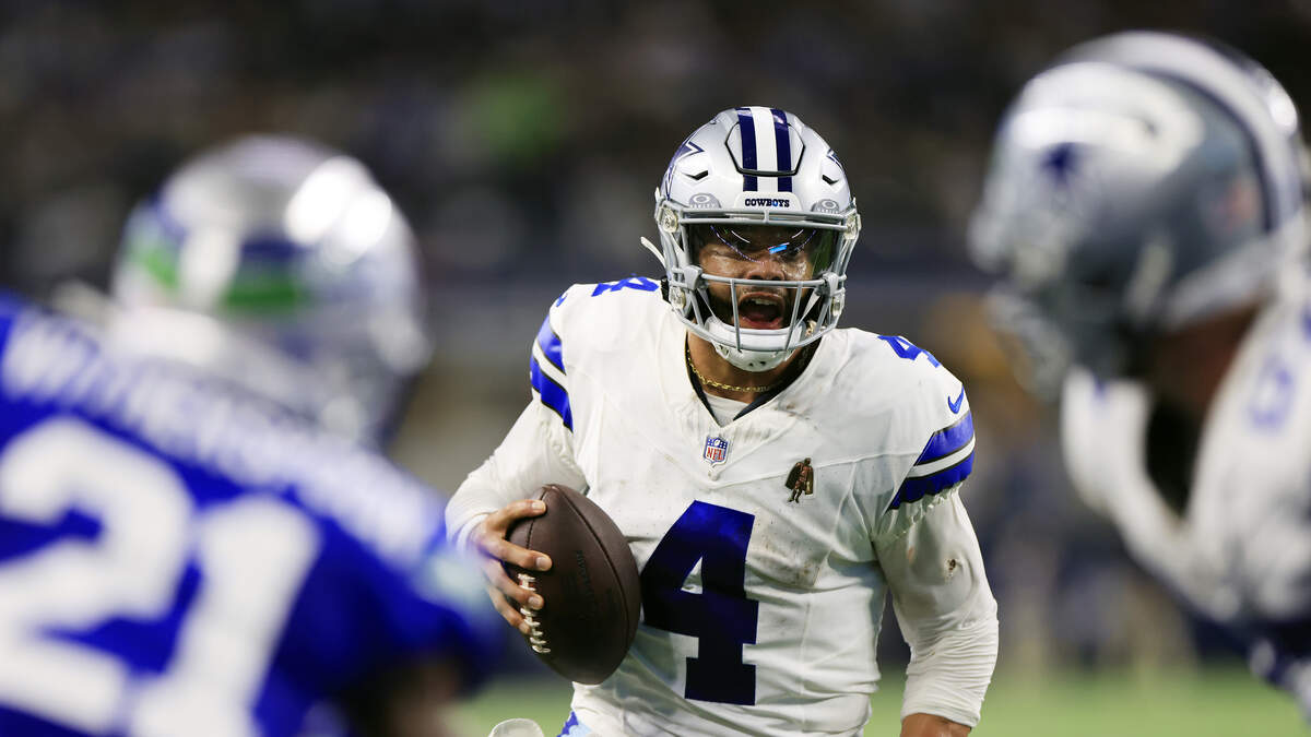 Quarterback Dak Prescott #4 of the Dallas Cowboys scrambles during the 2nd quarter of the game against the Seattle Seahawks at AT&T Stadium on November 30, 2023 in Arlington, Texas.