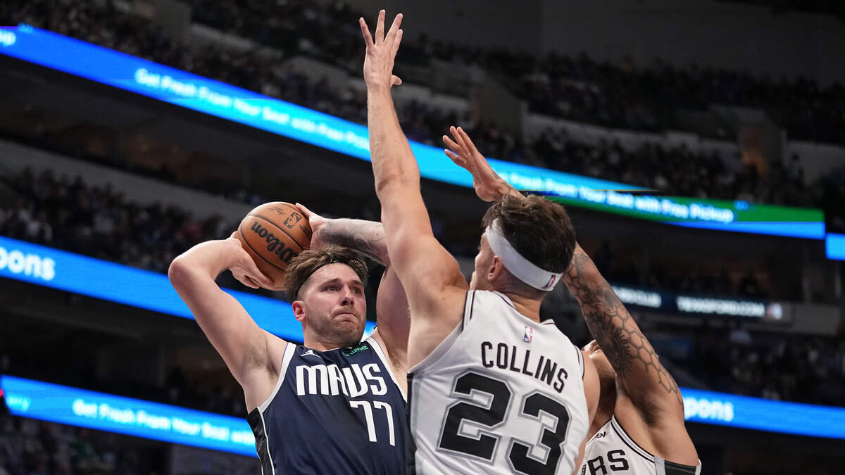 Luka Doncic #77 of the Dallas Mavericks looks to pass as Zach Collins #23 and Jeremy Sochan #10 of the San Antonio Spurs defend during the second half at American Airlines Center on December 23, 2023 in Dallas, Texas.