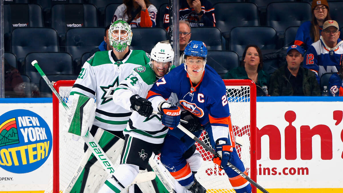 Joel Hanley #44 of the Dallas Stars and Anders Lee #27 of the New York Islanders battle for position during the third period at UBS Arena on January 21, 2024 in Elmont, New York.