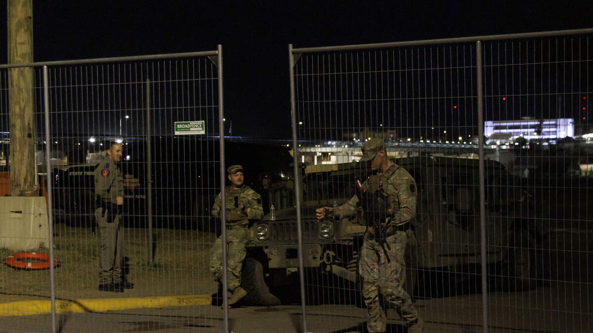 National Guard soldiers and a Texas DPS trooper guard the entrance to Shelby Park on February 3, 2024 in Eagle Pass, Texas.