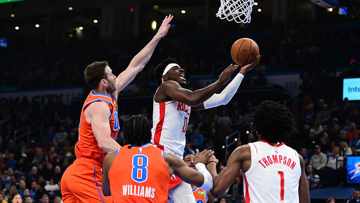 Aaron Holiday #0 of the Houston Rockets goes up for a shot in the lane during the first half against the Oklahoma City Thunder at Paycom Center on February 27, 2024 in Oklahoma City, Oklahoma.