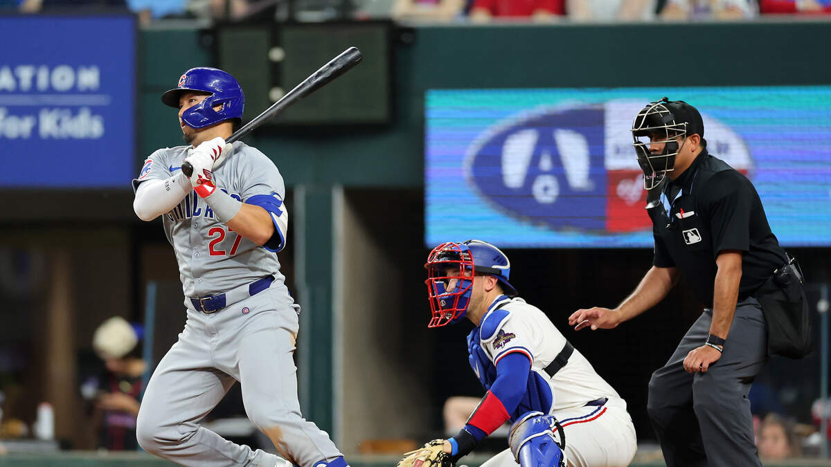 Seiya Suzuki #27 of the Chicago Cubs hits an RBI single against the Texas Rangers during the ninth inning at Globe Life Field on March 31, 2024 in Arlington, Texas.