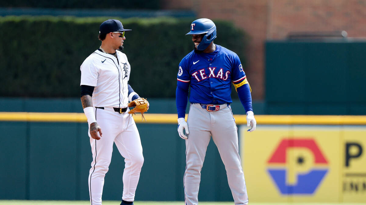 Adolis Garcia #53 of the Texas Rangers talks with Javier Báez #28 of the Detroit Tigers at second base in the sixth inning of a game at Comerica Park on April 17, 2024 in Detroit, Michigan.