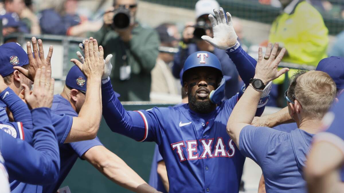 Adolis García #53 of the Texas Rangers celebrates after hitting a home run against the Detroit Tigers during the fourth inning at Comerica Park on April 18, 2024 in Detroit, Michigan.