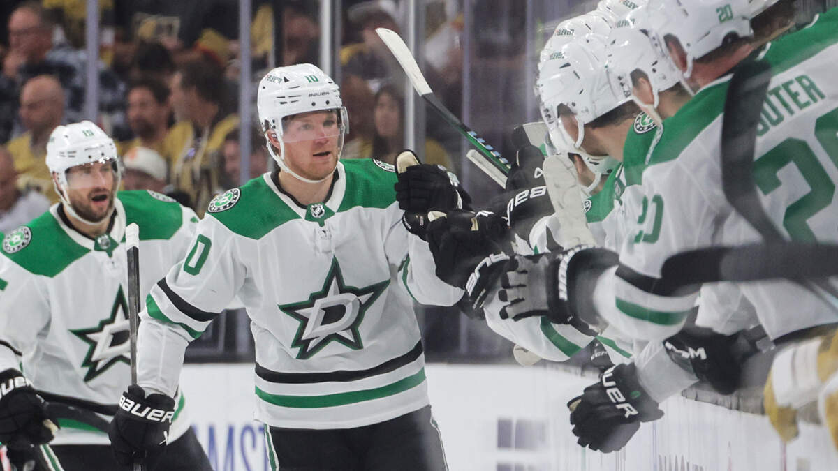 Ty Dellandrea #10 of the Dallas Stars celebrates with teammates on the bench after scoring a goal against the Vegas Golden Knights in the second period of Game Four of the First Round of the 2024 Stanley Cup Playoffs at T-Mobile Arena on April 29, 2024 in Las Vegas, Nevada.