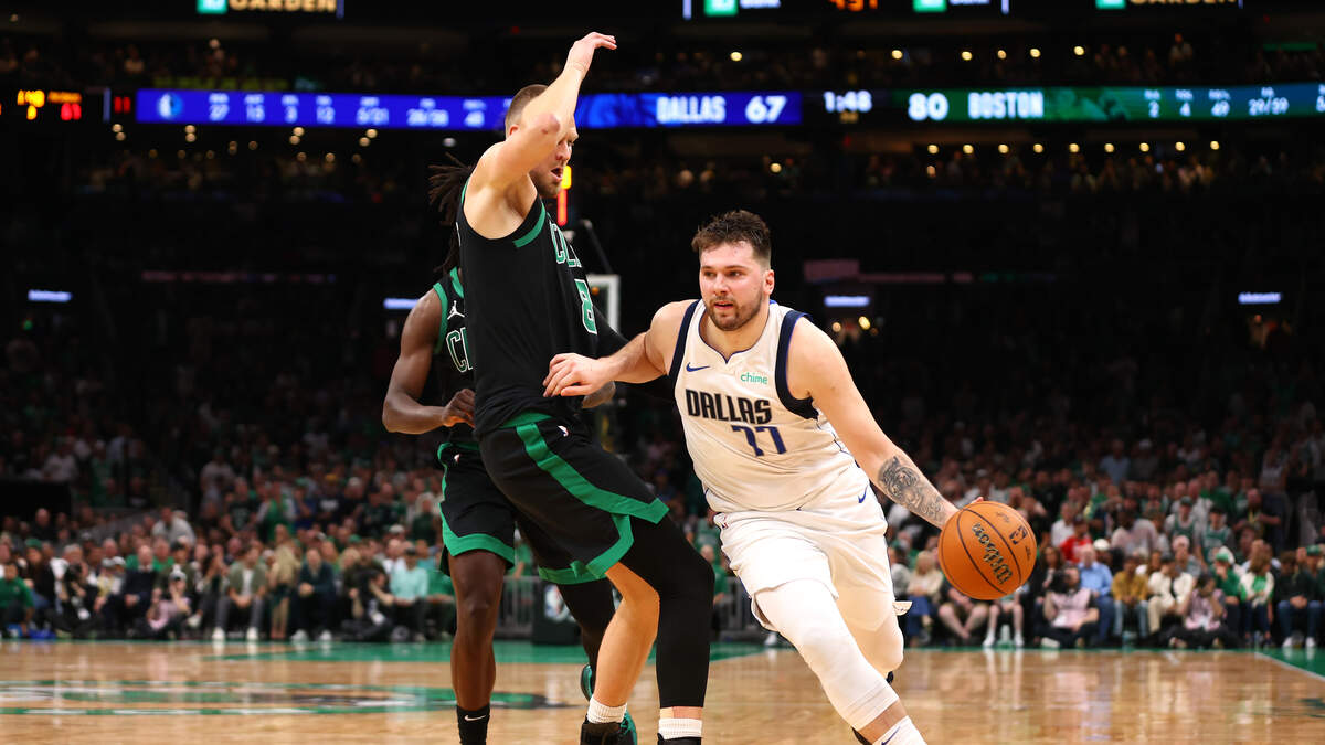 Luka Doncic #77 of the Dallas Mavericks drives to the basket against Kristaps Porzingis #8 of the Boston Celtics during the third quarter in Game Two of the 2024 NBA Finals at TD Garden on June 09, 2024 in Boston, Massachusetts.