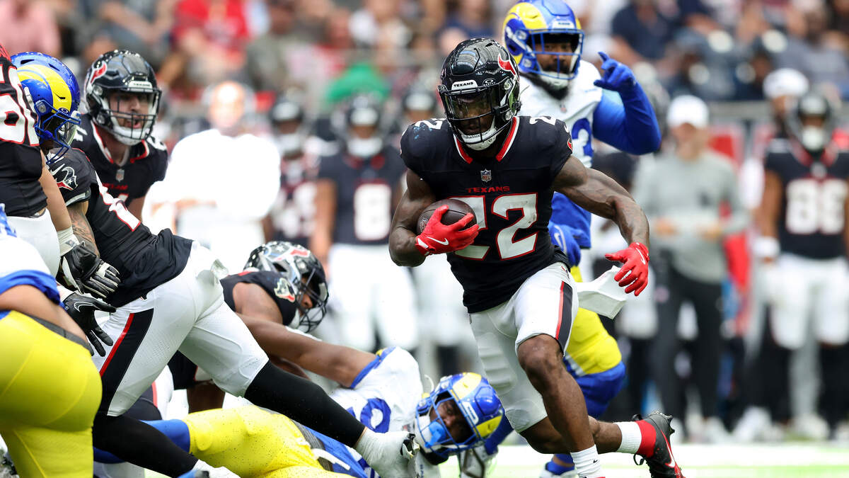 Cam Akers #22 of the Houston Texans runs the ball against the Los Angeles Rams in the first quarter during the preseason game at NRG Stadium on August 24, 2024 in Houston, Texas.
