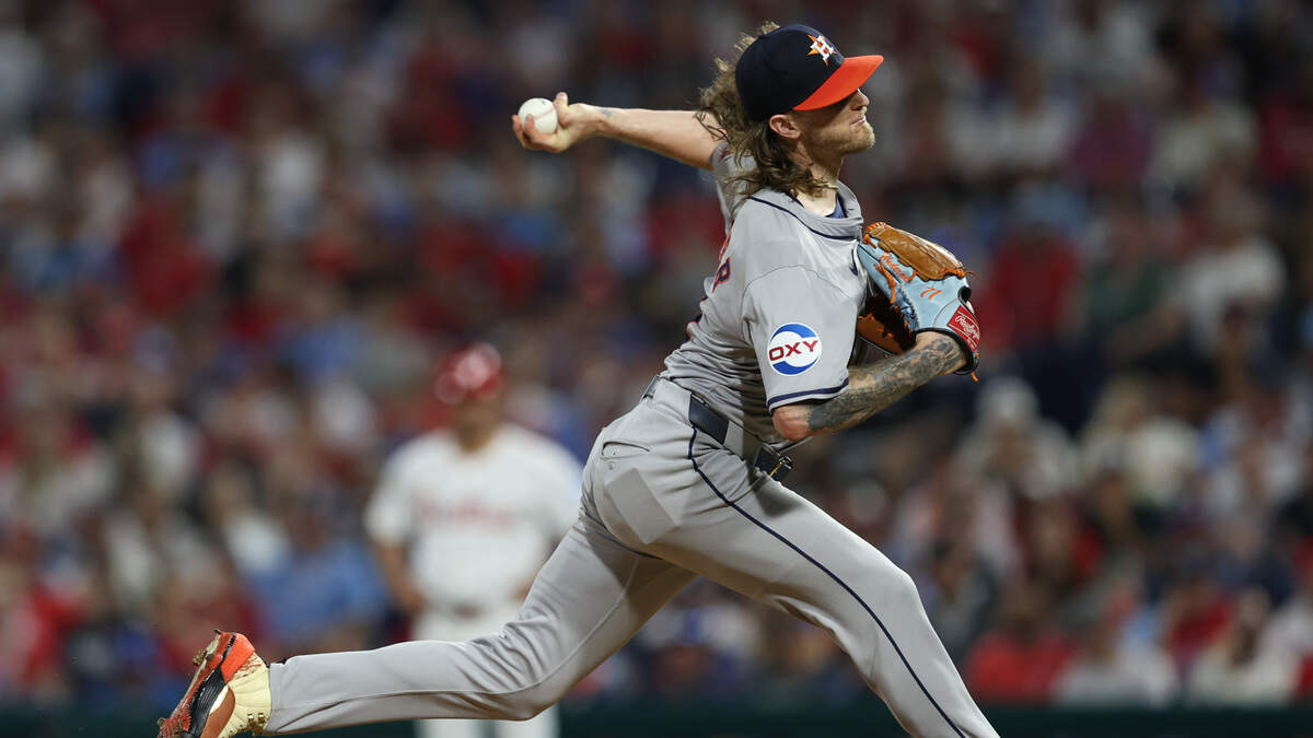 Josh Hader #71 of the Houston Astros pitches in the ninth inning against the Philadelphia Phillies at Citizens Bank Park on August 26, 2024 in Philadelphia, Pennsylvania.