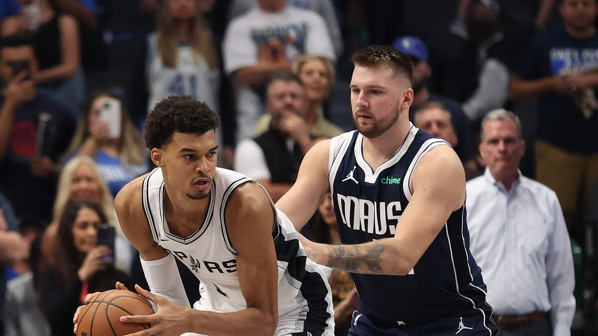 Victor Wembanyama #1 of the San Antonio Spurs is defended by Luka Doncic #77 of the Dallas Mavericks during the first quarter of the game at American Airlines Center on October 24, 2024 in Dallas, Texas.