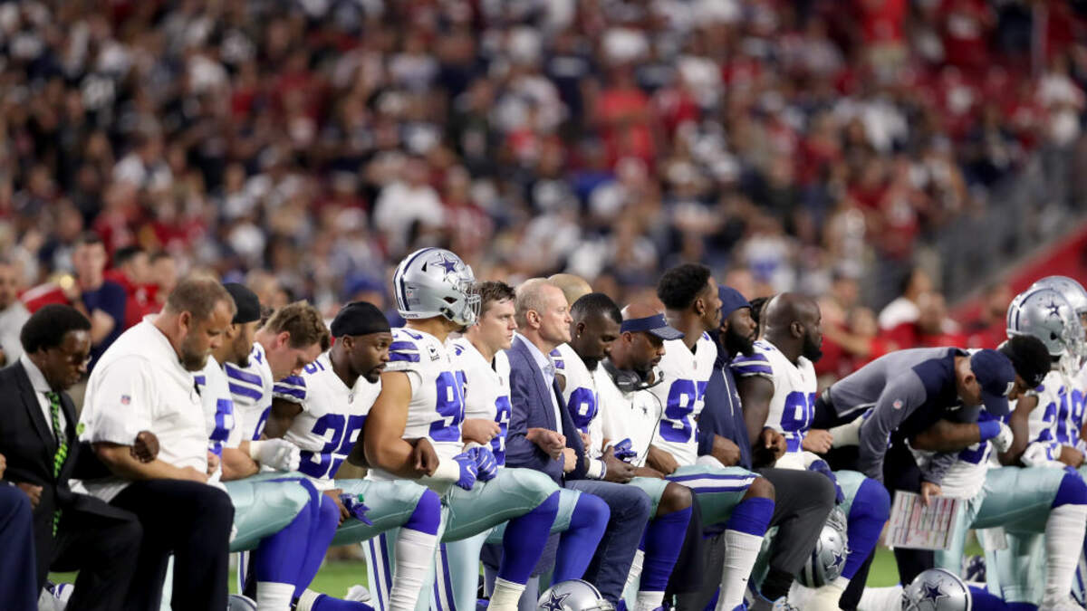 Dallas Cowboys owner Jerry Jones joined his players in taking a knee before the national anthem in tonight's Monday Night Football game in Arizona. Jones locked arms with his players and the entire team took a knee, but they stood when the anthem played. The Arizona Cardinals also stood and locked arms with members of the military during the anthem.